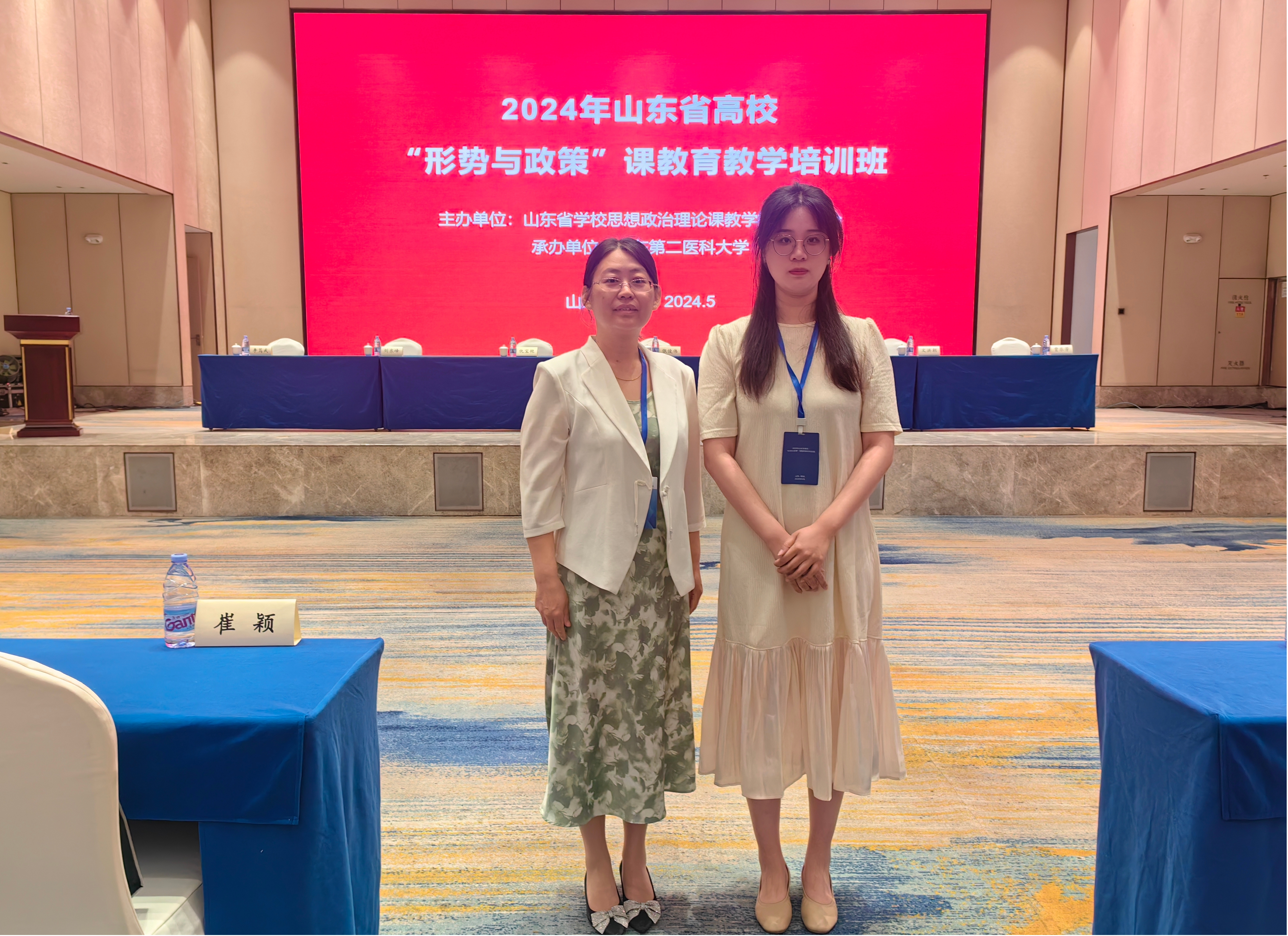 为认真学习贯彻习近平新时代中国特色社会主义思想和党的二十大精神,加强全省高校“形势与政策”课课程建设,努力提升课程教师队伍能力,5月9日至12日,2024年山东省高校“形势与政策”课教育教学培训班在山东潍坊举行,我院教师许雁萍、陈奕然参加培训。