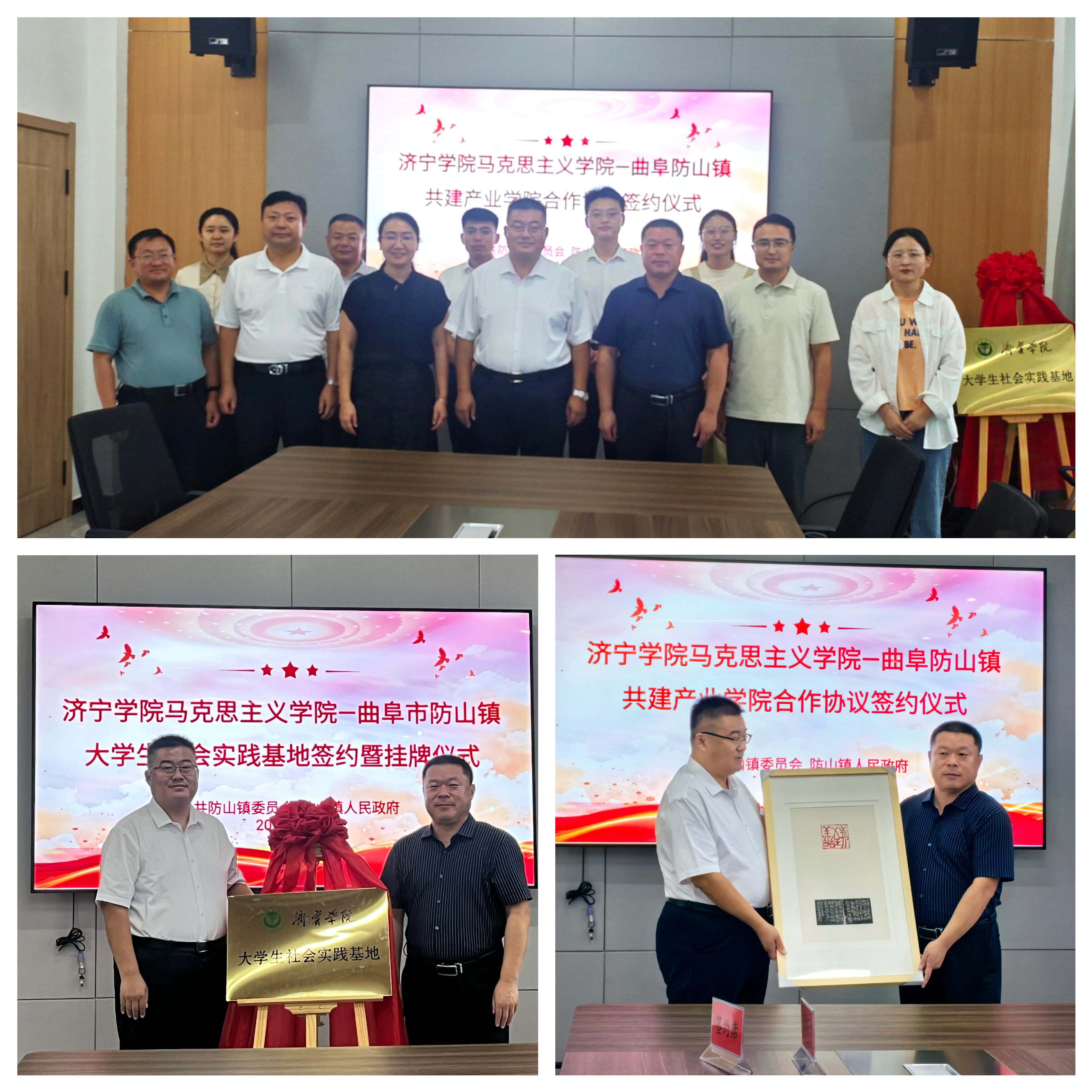 双方签署了“大思政课”实践教学基地协议、共建产业学院合作协议、大学生社会实践基地协议,李效民、丁龙共同为伟德国际1949大学生社会实践基地揭牌,李效民向曲阜市防山镇赠予了文创作品《止于至善》。