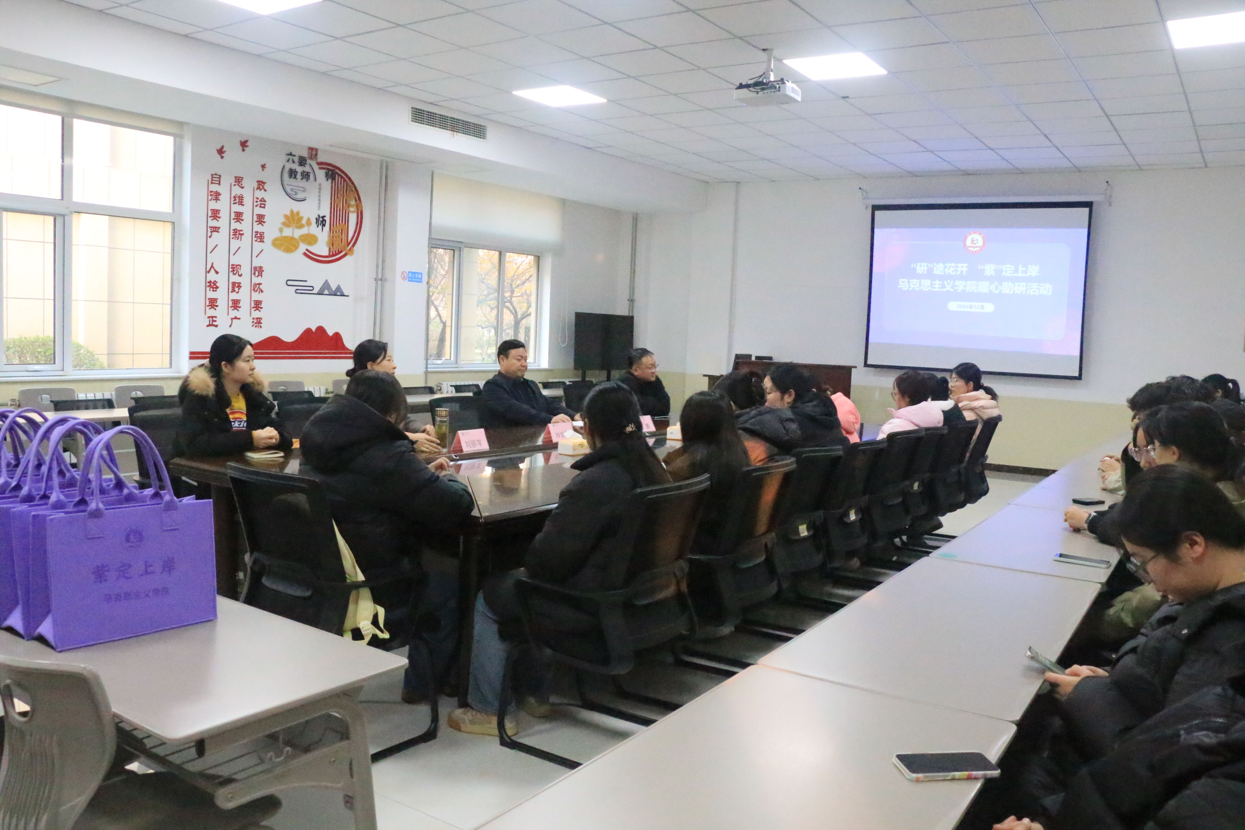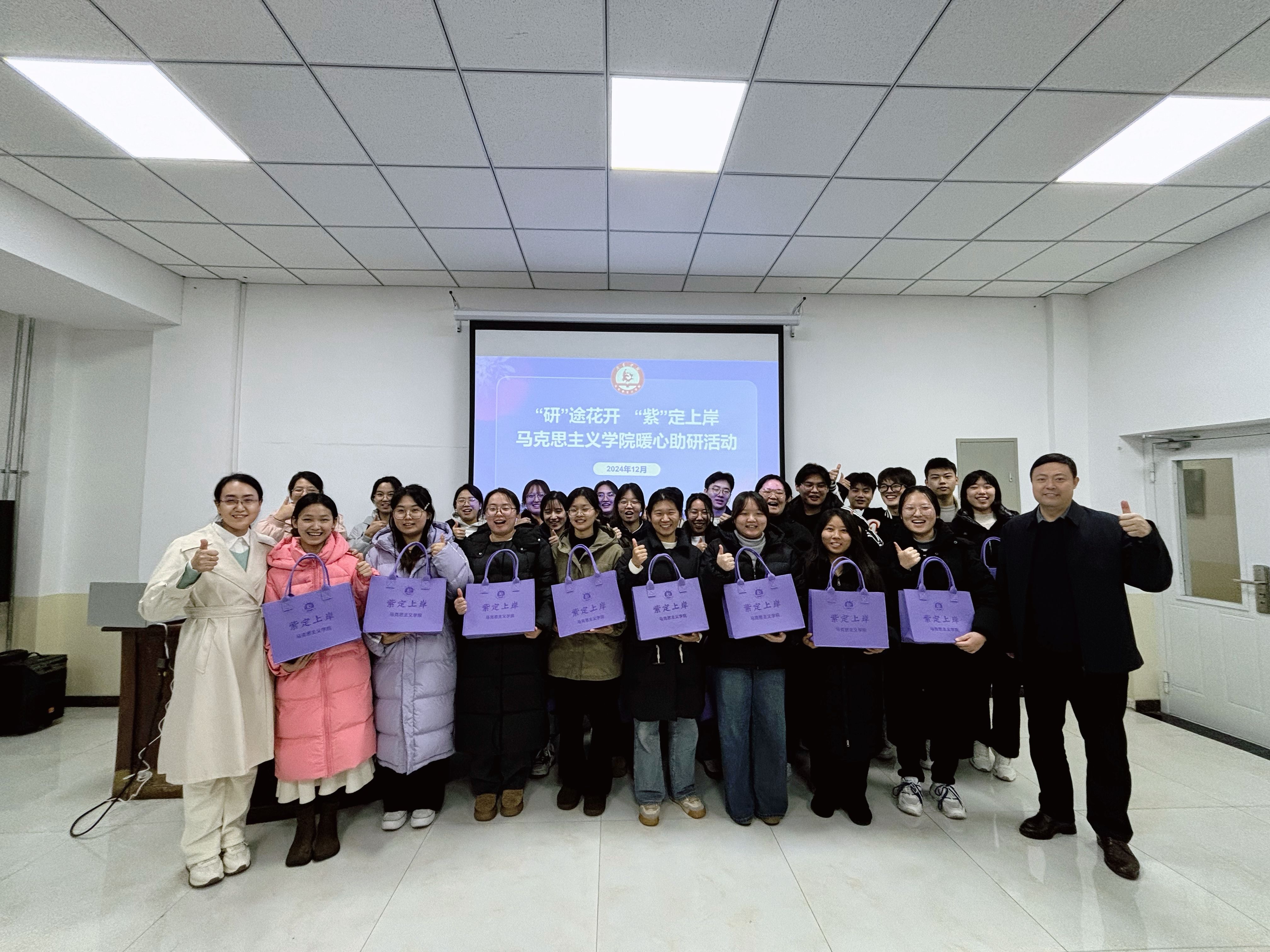 为缓解考研压力,鼓励更多学生坚定信心,从容考研,伟德国际1949始于英国于12月3日举办“研”途花开、“紫”定上岸暖心助研活动,活动在该院会议室举行,伟德国际1949始于英国副院长(主持工作)沙世蕤、学院党委副书记郝鹏、学术副院长刘丽苹、团委书记姚海生、团委副书记付茹雪及26位参加考试的同学与会。此次加油鼓劲会由郝鹏主持。