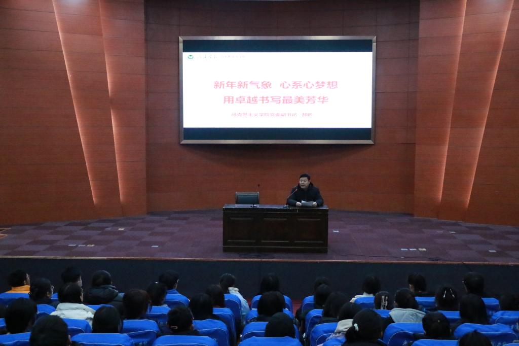 郝鹏以《新年新气象心系心梦想用卓越书写最美芳华》为题,作了四个方面的强调,一是统一思想,提振精神,迅速调整学习状态。希望同学们要快收心、早起步、开好头;二是牢记安全,杜绝隐患,营造良好学习环境。提醒同学们要筑牢安全意识,注意消防安全、人身安全、食品和药品安全、财物安全、防溺水等;三是转变作风,强化学风,不断提升学习质效。教导同学们要讲大局、讲学风、讲创新、讲团结、讲实干;四是严守纪律,身体力行,夯实强化学习保障。要求同学们要遵守课堂纪律、生活纪律、组织纪律。
