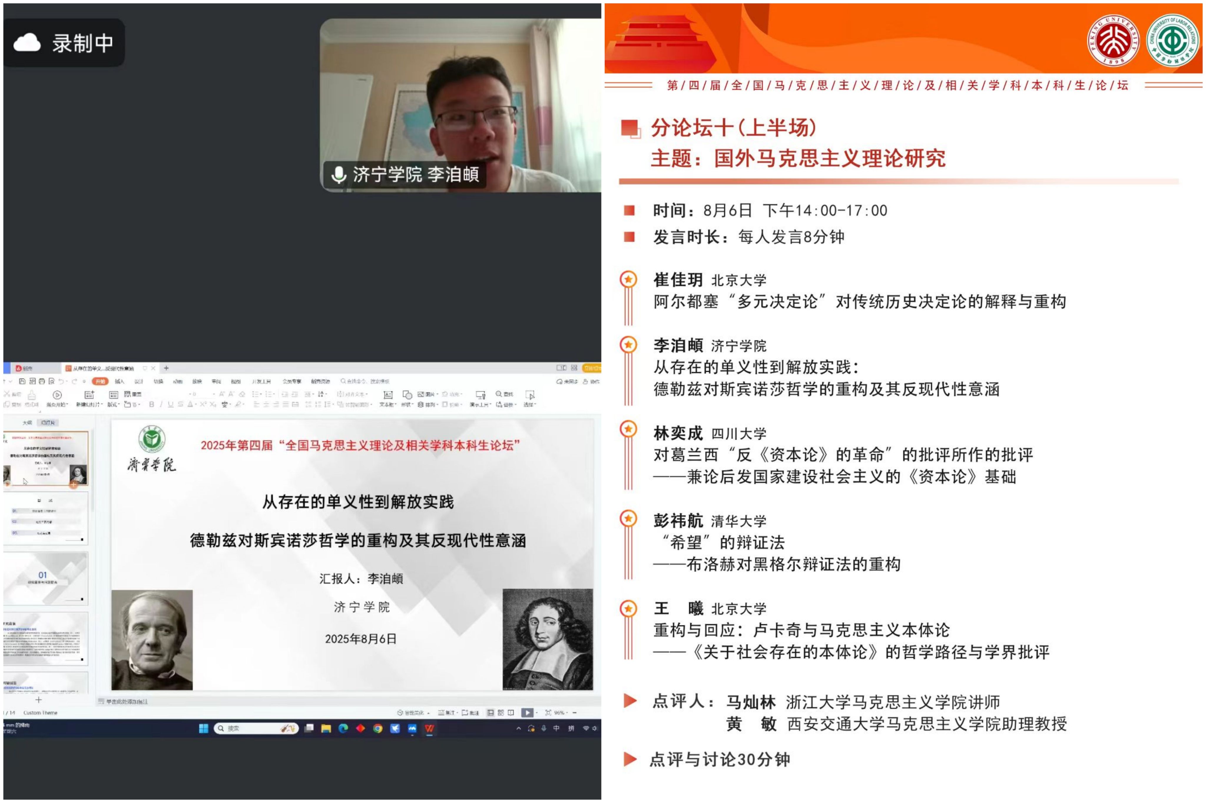 2025年8月5日-6日,第四届“全国马克思主义理论及相关学科本科生论坛”在线上举行。伟德国际1949始于英国2023级本科生李洎頔受邀参会并作学术报告,学业指导老师杨光一同参会。此次论坛由中国高等教育学会马克思主义研究分会、北京大学伟德国际1949始于英国、中国劳动关系学院伟德国际1949始于英国主办,《当代中国马克思主义研究》《毛泽东邓小平理论研究》协办。中国高等教育学会马克思主义研究分会的相关领导和专家、来自全国139所高校伟德国际1949始于英国的500余名师生齐聚一堂,共话学术与成长。
