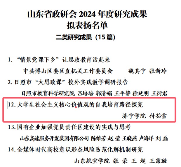 近日,山东省思想政治工作研究会2024年度研究成果拟表扬名单发布,伟德国际1949始于英国付茹雪老师的研究成果《大学生社会主义核心价值观的自我培育路径探究》入选二类研究成果,这既是对学院在思想政治工作研究领域深耕细作的肯定,更是学院团队践行理论研究服务青年思想引领需求的生动实践。