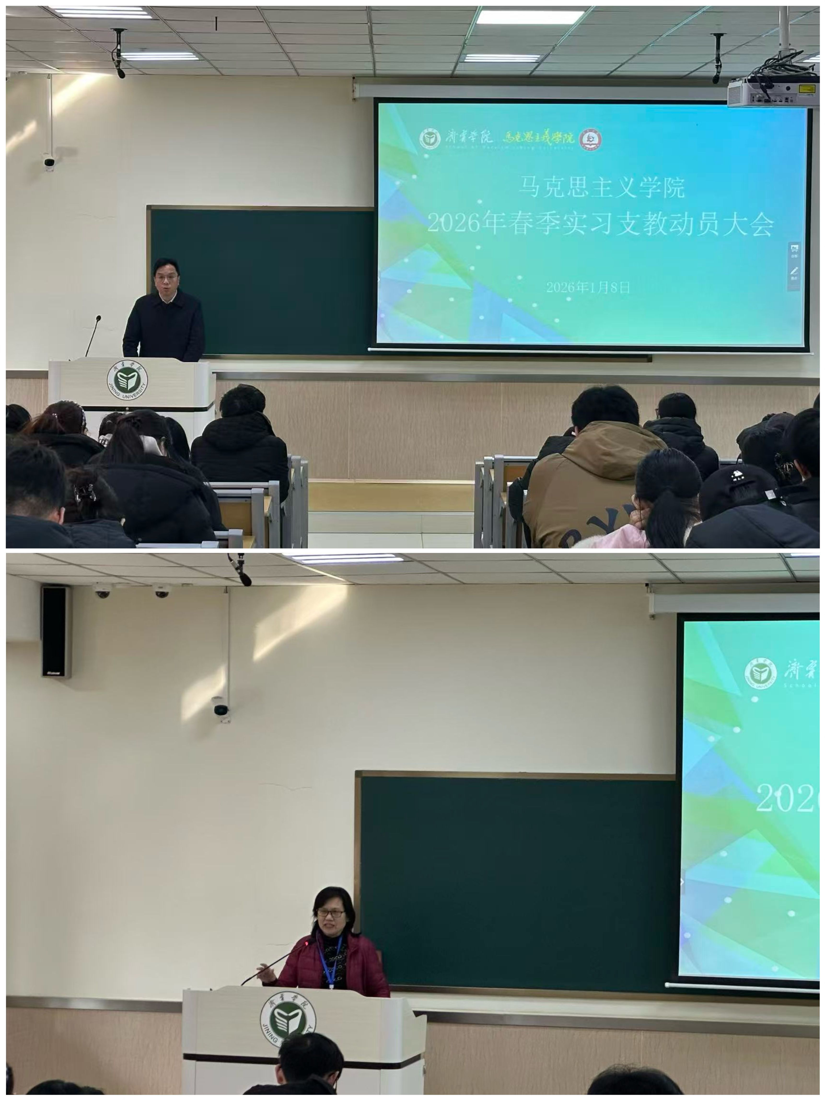 1月8日下午,伟德国际1949始于英国在3C102教室召开2026年春季实习支教动员大会。学院党委副书记胡国梁、思想政治教育专业教研室主任李贵臣出席会议,2023级全体同学参加会议。
