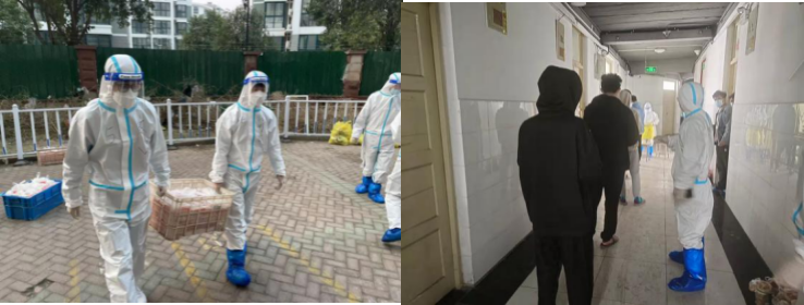 处于封闭管控区的部分学生志愿者,化身可爱的“大白”,穿起了厚厚的“白衣战袍”,唯一能显现的只有无惧无畏的眼神和坚定的步伐。他们成为了疫情战斗中坚强、可靠的力量,承担着为封闭的同学们送饭、回收楼层生活垃圾和协助医护人员核酸检测等多项任务。他们挥汗如雨,竭尽全力的为同学们提供服务和保障。