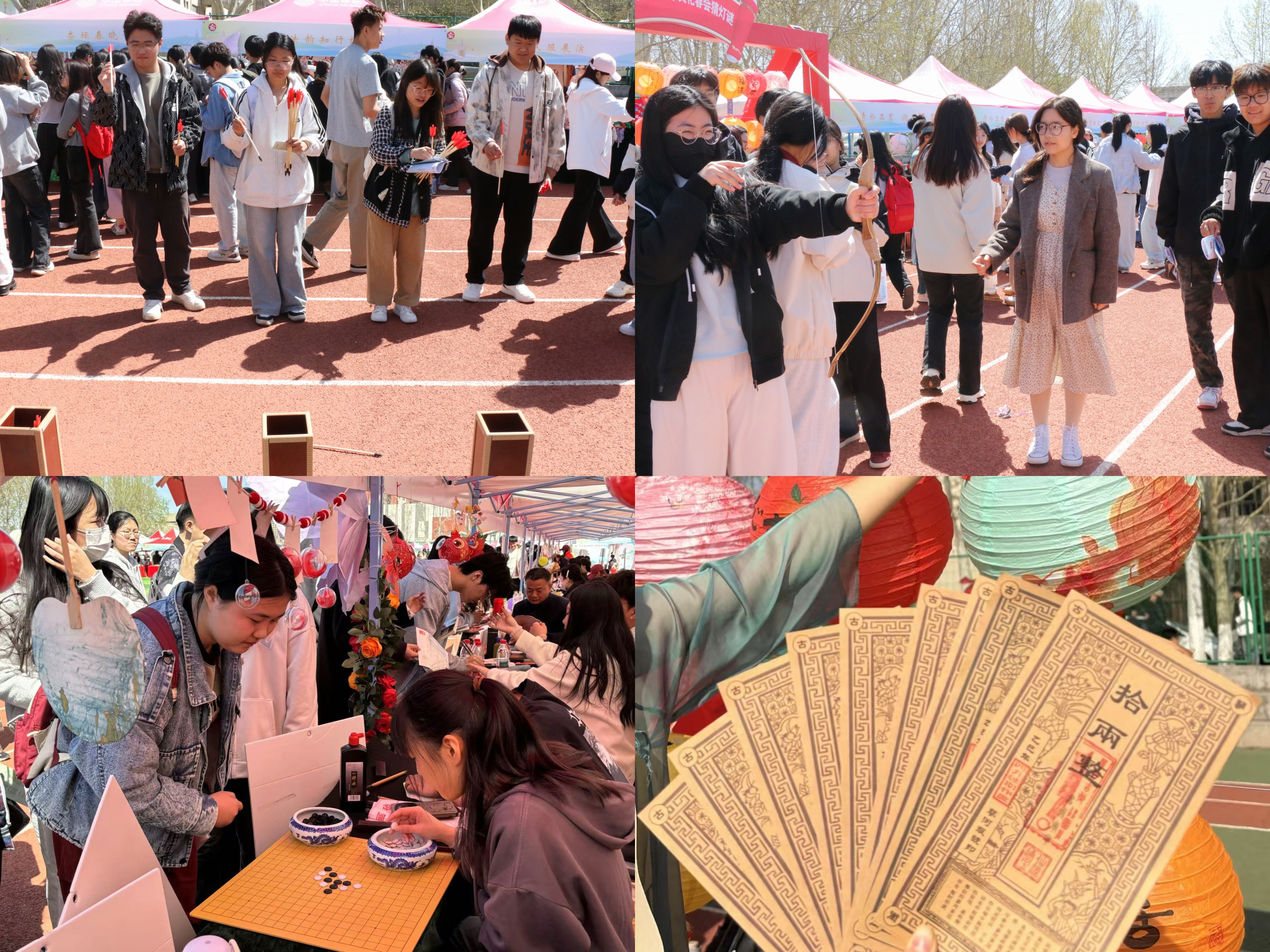 活动伊始,捶丸、射箭、投壶、下棋等传统竞技项目区域便热闹非凡。同学们身姿矫健,尽显古人风雅。在捶丸场地,参赛者们手持球棒,专注瞄准,挥棒击球,小球沿着草地滚动,引得围观者阵阵喝彩;射箭区域,同学们拉弓搭箭,目光如炬,箭镞离弦瞬间,风声呼啸,正中靶心;投壶处,大家屏气敛息,将箭杆精准投入壶中,清脆的落箭声此起彼伏;下棋对弈者则在棋盘间纵横捭阖,深思熟虑,一招一式尽显智慧较量。参与者凭借在这些项目中的出色表现赢得银票道具,每一张银票都承载着努力与荣耀,更为后续体验丰富活动埋下伏笔。