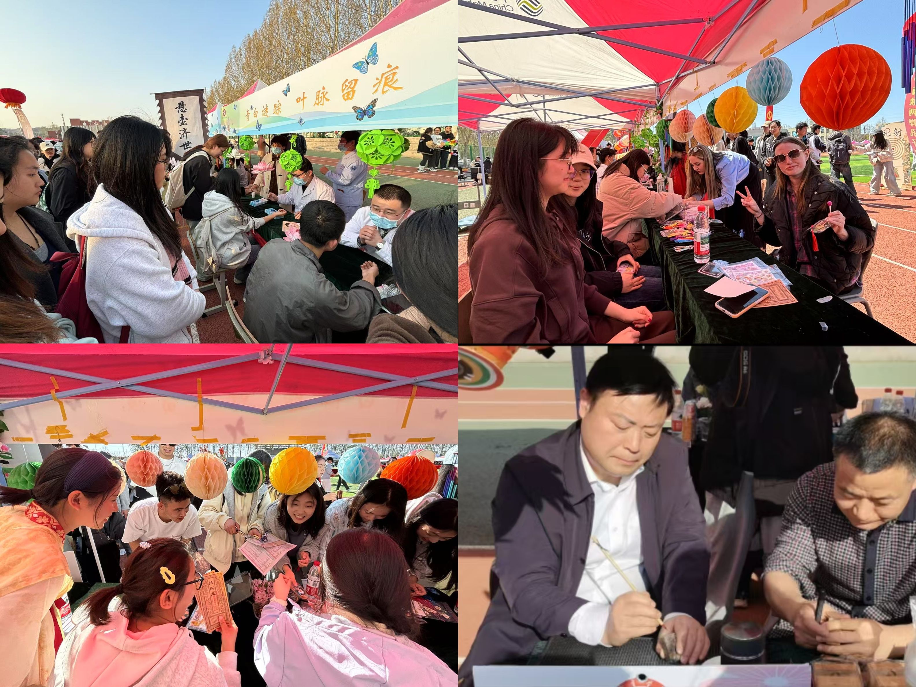 凭借辛苦赢得的银票,同学们开启了一场场奇妙的文化体验之旅。漆扇制作区,五彩颜料在扇面上晕染出绚丽图案,或山水写意,在同学们巧手下,漆扇成为独一无二的艺术珍品;篆刻区域,刻刀游走于印石之间,篆文逐渐清晰,古老文字仿佛穿越时空,诉说着千年故事;标本制作台前,大家选用精心处理过的树叶、花朵,将自然之美定格在方寸之间,领悟科学与艺术融合的魅力。尤为特别的是,曲阜市中医院中医专家团队带来“悬壶济世”项目,中医师们为同学们把脉问诊,讲解中医养生知识,展示针灸、推拿等传统技法,让大家切身感受中医的博大精深,引得众人纷纷排队体验。