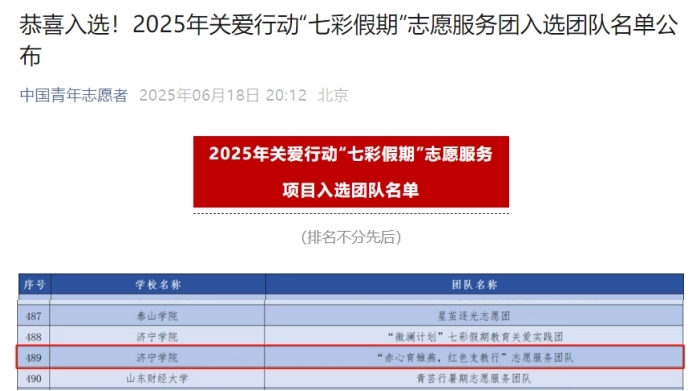 6月18日,“中国青年志愿者”微信公众号公布了2025年关爱行动“七彩假期”志愿服务团入选团队名单,由伟德国际1949始于英国团委书记、“红色会客厅”理论宣讲辅导员工作室主持人姚海生指导,姜舒琪等学生组成的“赤心育雏燕,红色支教行”志愿服务团队成功入选。