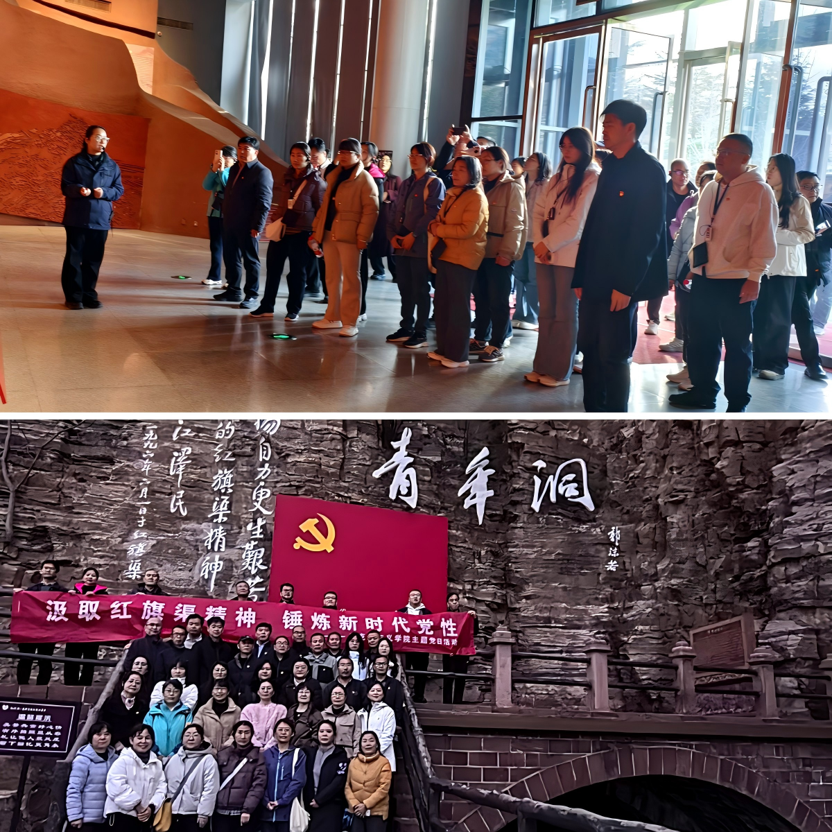 在红旗渠畔,全体教师参观了红旗渠纪念馆与青年洞。纪念馆内,珍贵的历史影像、实物展陈以及讲解员的生动讲述,让大家深切感受到上世纪60年代林县人民“重新安排林县河山”的豪情壮志——30万群众历时十年,以“一锤一钎一双手”,在悬崖峭壁间凿出“人工天河”,铸就了“自力更生、艰苦创业、团结协作、无私奉献”的红旗渠精神。行走在巍巍太行之间,驻足于青年洞前,全体党员深刻体会到那段艰苦卓绝的奋斗历程,进一步坚定了为党育人、为国育才的初心与使命。